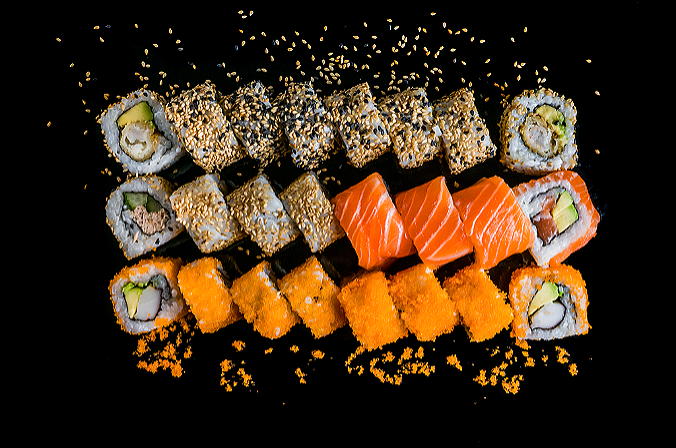 8 stuks inside out zalm, 8stuks inside out california, 6 stuks maki zalm, 6 stuks maki tonijn 6 stuks maki komkommer, 2 nigiri zalm 2 ngiri tonijn 2 nigiri garnaal